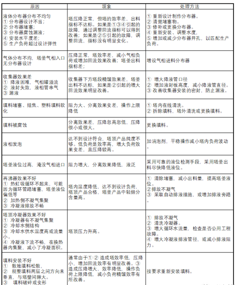 下面列举一些不当原因导致的精馏塔异常现象和处理方法